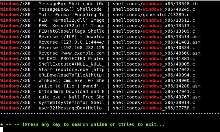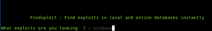 Let’s try the ‘Findsploit’ tool. Okay, let’s search for something. For example ‘windows’ exploits.