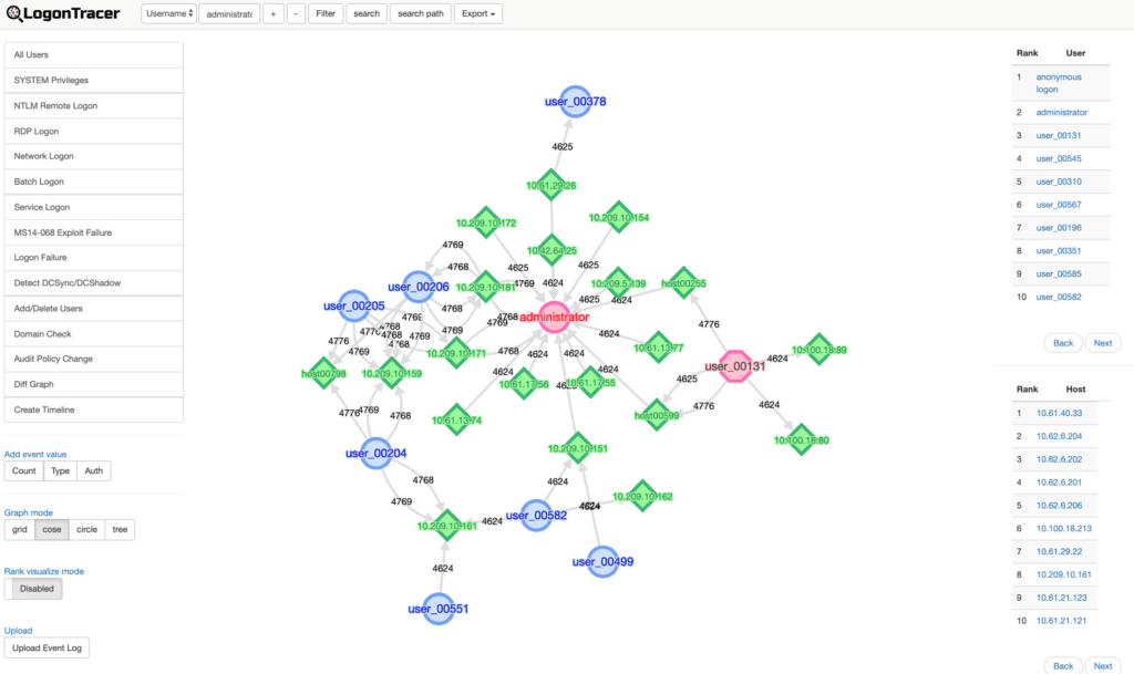 LogonTracer is a tool to investigate malicious logon by visualizing and analyzing Windows Active Directory event logs. This tool associates a host name (or an IP address) and account name found in logon-related events and displays it as a graph. This way, it is possible to see in which account login attempt occurs and which host is used.