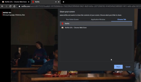 After adding the extension, open Netflix and sign in to your account. Then, play the Netflix show or movie from which you want to create GIF. Figure out the exact timestamp for the part that your want in the GIF. Once done, press G on your keyboard moments before the beginning timestamp of the scene. This opens a screen share overlay. Head to the third section in the overlay i.e., Chrome Tab and click on the Netflix there.