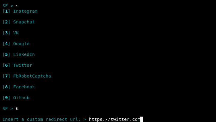 We’ve selected the popular Twitter option. Now the tool is asking for a custom redirect URL and we entered the original twitter login panel URL. Now the tool started building the phishing web page for Twitter.