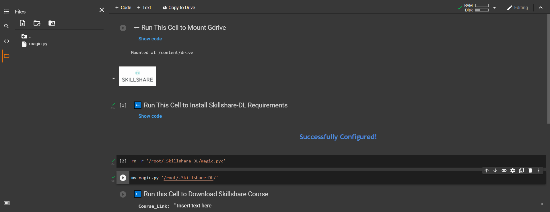 - After executing Step 2 ( Run This Cell to Install Skillshare-DL Requirements ) in the notebook;