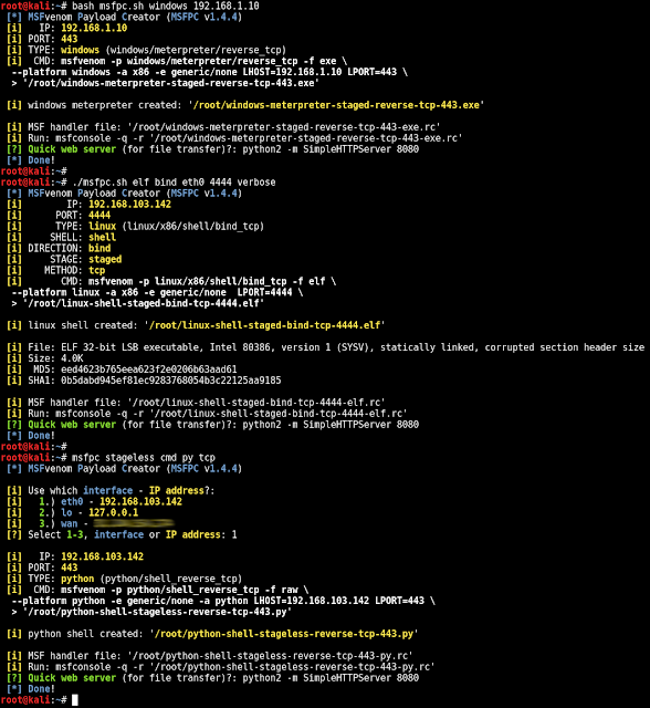 Fully automating msfvenom & Metasploit is the end goal (well as to be be able to automate MSFPC itself) . The rest is to make the user’s life as easy as possible (e.g. IP selection menu , msfconsole resource file/commands , batch payload production and able to enter any argument in any order (in various formats/patterns) ).