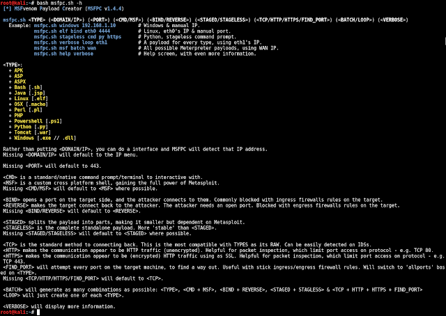 $ bash msfpc.sh -h -v [*] MSFvenom Payload Creator (MSFPC v1.4.4) msfpc.sh <TYPE> (<DOMAIN/IP>) (<PORT>) (<CMD/MSF>) (<BIND/REVERSE>) (<STAGED/STAGELESS>) (<TCP/HTTP/HTTPS/FIND_PORT>) (<BATCH/LOOP>) (<VERBOSE>) Example: msfpc.sh windows 192.168.1.10 # Windows & manual IP. msfpc.sh elf bind eth0 4444 # Linux, eth0's IP & manual port. msfpc.sh stageless cmd py https # Python, stageless command prompt. msfpc.sh verbose loop eth1 # A payload for every type, using eth1's IP. msfpc.sh msf batch wan # All possible Meterpreter payloads, using WAN IP. msfpc.sh help verbose # Help screen, with even more information. <TYPE>: + APK + ASP + ASPX + Bash [.sh] + Java [.jsp] + Linux [.elf] + OSX [.macho]< br/> + Perl [.pl] + PHP + Powershell [.ps1] + Python [.py] + Tomcat [.war] + Windows [.exe // .dll] Rather than putting <DOMAIN/IP>, you can do a interface and MSFPC will detect that IP address. Missing <DOMAIN/IP> will default to the IP menu. Missing <PORT> will default to 443. <CMD> is a standard/native command prompt/terminal to interactive with. <MSF> is a custom cross platform shell, gaining the full power of Metasploit. Missing <CMD/MSF> will default to <MSF> where possible. Note: Metasploit doesn't (yet!) support <CMD/MSF> for every <TYPE> format. <CMD> payloads are generally smaller than <MSF> and easier to bypass EMET. Limit Metasploit post modules/scripts support. <MSF> payloads are generally much l arger than <CMD>, as it comes with more features. <BIND> opens a port on the target side, and the attacker connects to them. Commonly blocked with ingress firewalls rules on the target. <REVERSE> makes the target connect back to the attacker. The attacker needs an open port. Blocked with engress firewalls rules on the target. Missing <BIND/REVERSE> will default to <REVERSE>. <BIND> allows for the attacker to connect whenever they wish. <REVERSE> needs to the target to be repeatedly connecting back to permanent maintain access. <STAGED> splits the payload into parts, making it smaller but dependent on Metasploit. <STAGELESS> is the complete standalone payload. More 'stable' than <STAGED>. Missing <STAGED/STAGELESS> will default to <STAGED> where possible. Note: Metasploit doesn't (yet!) support <STAGED/STAGELESS> for every <TYPE> format. <STA GED> are 'better' in low-bandwidth/high-latency environments. <STAGELESS> are seen as 'stealthier' when bypassing Anti-Virus protections. <STAGED> may work 'better' with IDS/IPS. More information: https://community.rapid7.com/community/metasploit/blog/2015/03/25/stageless-meterpreter-payloads https://www.offensive-security.com/metasploit-unleashed/payload-types/ https://www.offensive-security.com/metasploit-unleashed/payloads/ <TCP> is the standard method to connecting back. This is the most compatible with TYPES as its RAW. Can be easily detected on IDSs. <HTTP> makes the communication appear to be HTTP traffic (unencrypted). Helpful for packet inspection, which limit port access on protocol - e.g. TCP 80. <HTTPS> makes the communication appear to be (encrypted) HTTP traffic using as SSL. Helpful for packet inspection, which limit port access on protocol - e.g. TCP 443. <FIND_PORT> will attempt every port on the target machine, to find a way out. Useful with stick ingress/engress firewall rules. Will switch to 'allports' based on <TYPE>. Missing <TCP/HTTP/HTTPS/FIND_PORT> will default to <TCP>. By altering the traffic, such as <HTTP> and even more <HTTPS>, it will slow down the communication & increase the payload size. More information: https://community.rapid7.com/community/metasploit/blog/2011/06/29/meterpreter-httphttps-communication <BATCH> will generate as many combinations as possible: <TYPE>, <CMD + MSF>, <BIND + REVERSE>, <STAGED + STAGLESS> & <TCP + HTTP + HTTPS + FIND_PORT> <LOOP> will just create one of each <TYPE>. <VERBOSE> will display more information.$