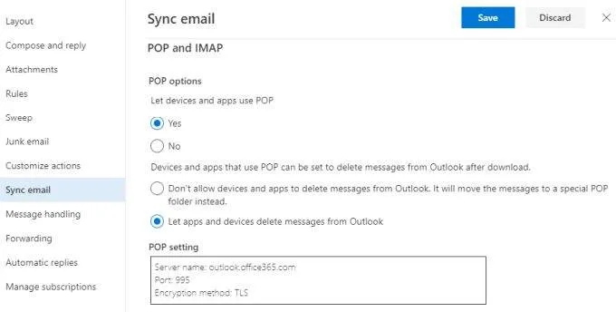 In the navigation pane of this pop-up window, click on Sync email . Scroll down to the POP and IMAP settings section.