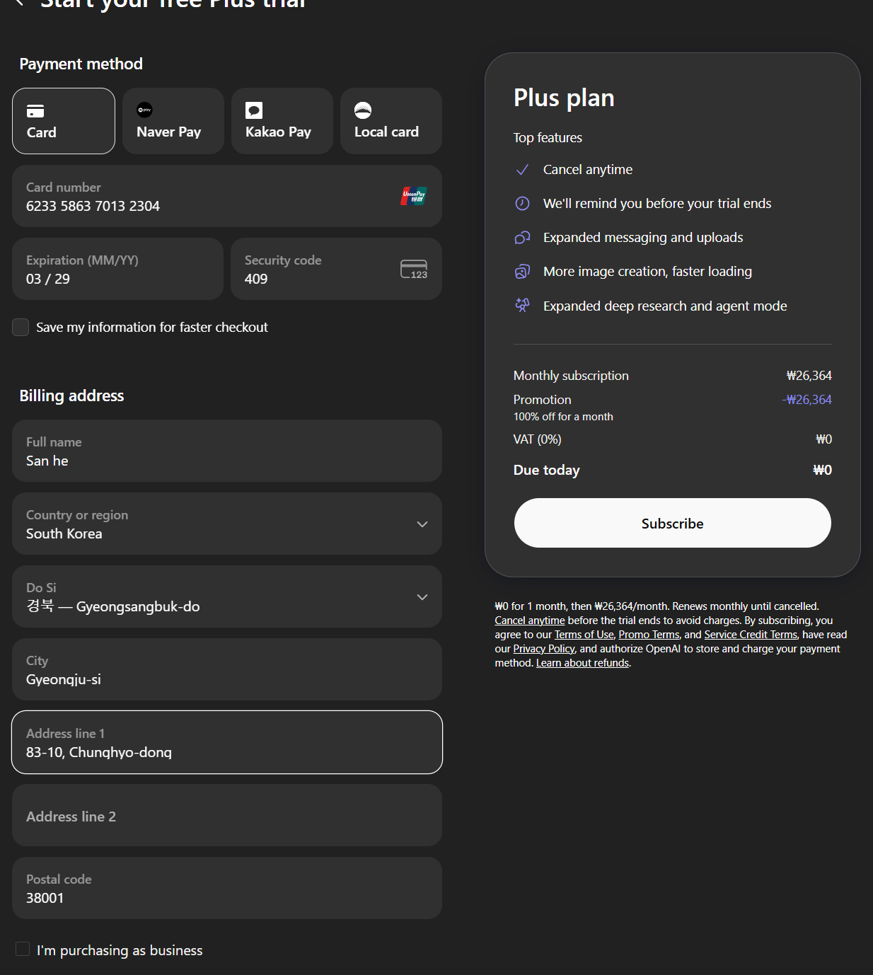 I just tried it again in different account. connected to vpn. checked ip location to confirm korea. logged in with gmail. below are the details i filled. got premium in first try.