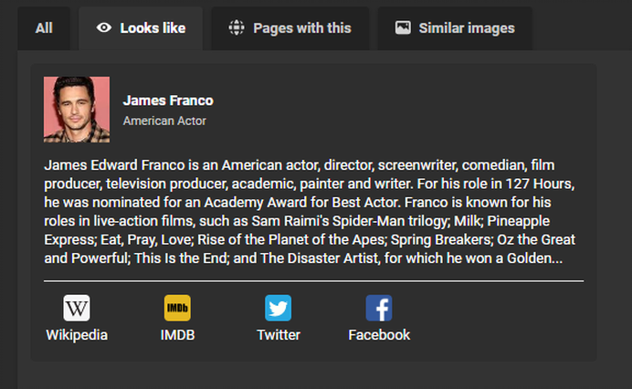 When we clicked on the “Looks like” tab at the top, Bing displayed a bio of James Franco.