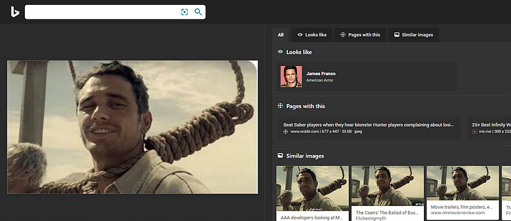When we clicked on the “Similar Images” tab, Bing displayed numerous images of Franco in the same movie.