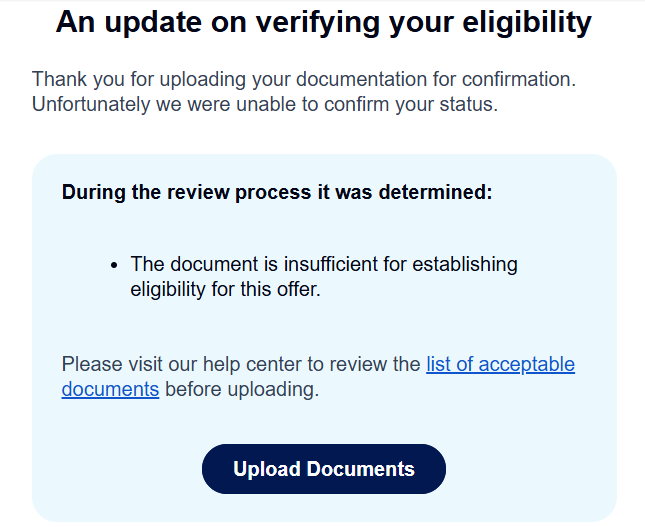 There was an error creating the discount request. Errors: Discount request could not be created. Discount request errors: We do not allow applicants to apply using this email domain. Please select a different email address.
