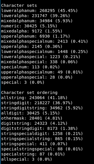 If we scroll down the results, we can find data on the character sets used. On this list, 45% of the passwords use a lower case alphabetic characters and numbers and 39% use just lower case alphabetic characters.