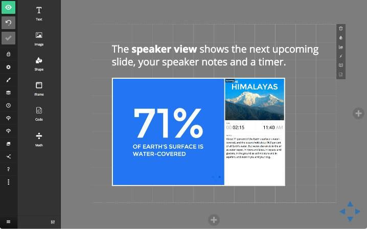 Slides makes your presentation work on any device. You can add media, import content from YouTube, Google Maps, and Vimeo , and even embed SVG images. What makes it more interesting is, you can use other people’s layouts, use Google fonts along with using templates and share presentations or embed them on your blog or site.