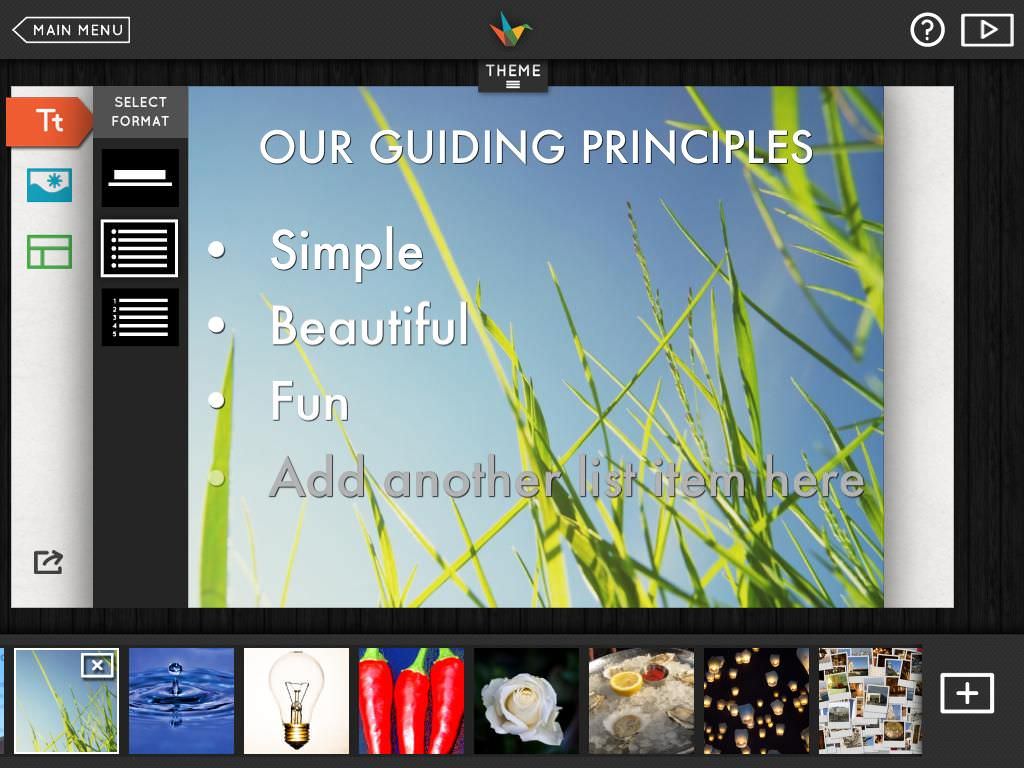 Haiku Deck is a simple and useful tool, though its interface looks little outdated. You can choose from a range of fonts, polished layouts, image filters , and more to create professionally designed presentations. It gives you access to 40+ million stock images on varied subjects that fit in almost every project.