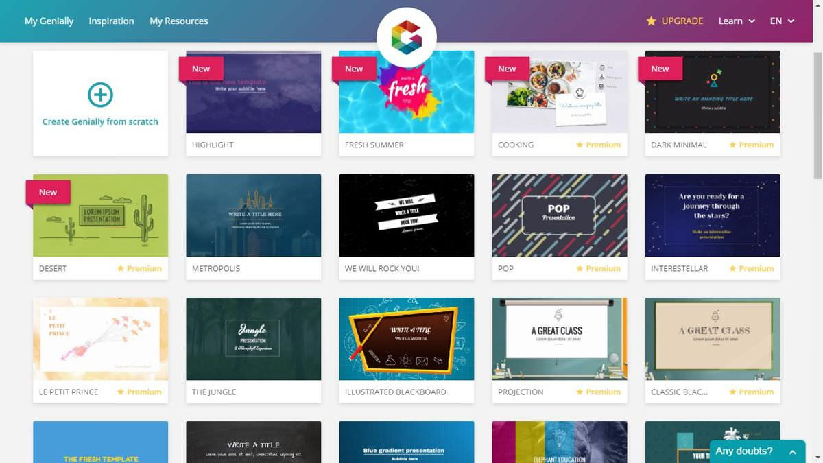 Genial.ly lets you put interactive effects and animations in your presentations. You can include content from a number of external services in your presentations, such as Spotify, YouTube, Google Maps, Amazon, etc. Additionally, you get access to various premium templates , using which you can create unlimited presentations.