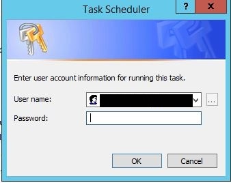Click OK and enter the username and password of the user account. *Note the user account will require ‘run scheduled task/batch file permissions’. Sensitive information removed from screenshot.