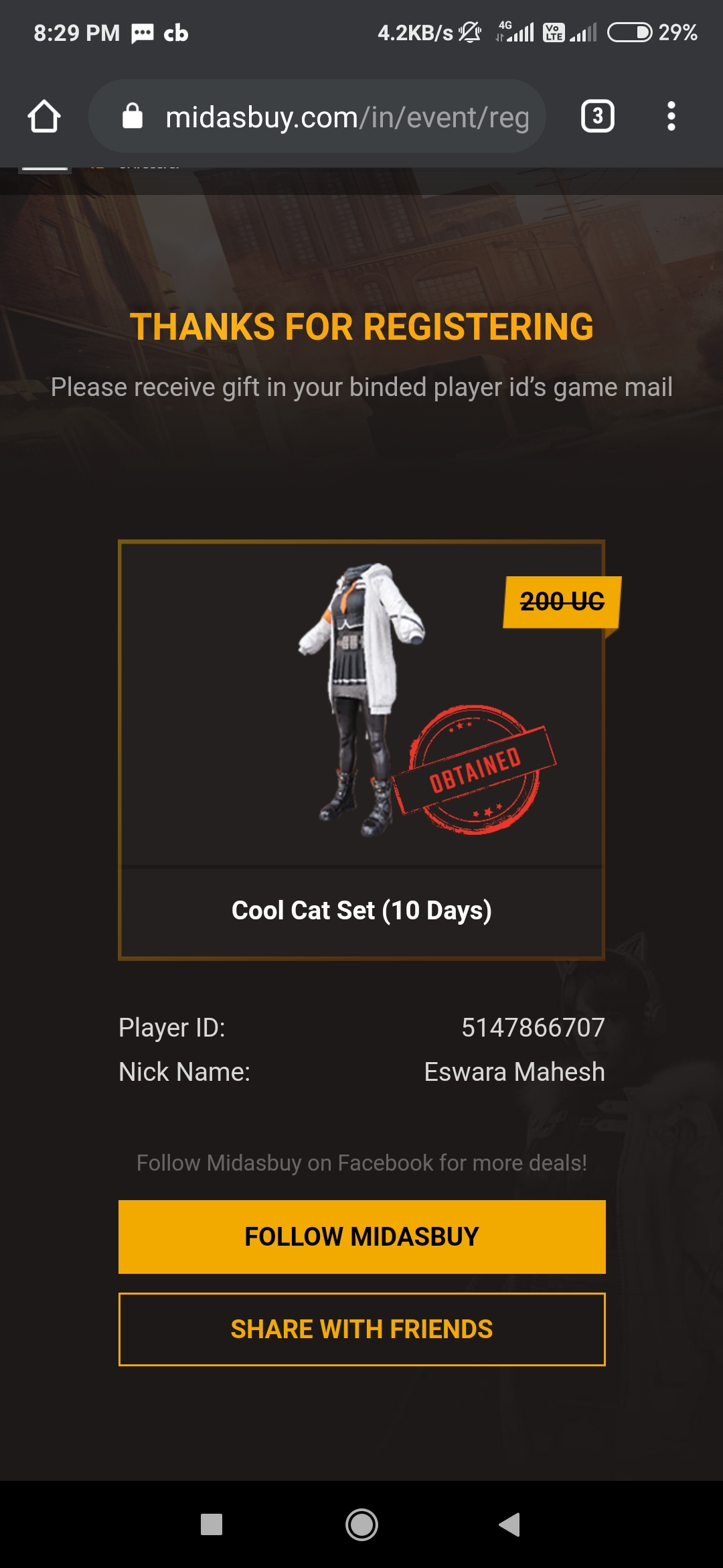 (If not registered pubg with fb then login with fb & enter pubg ID ) -