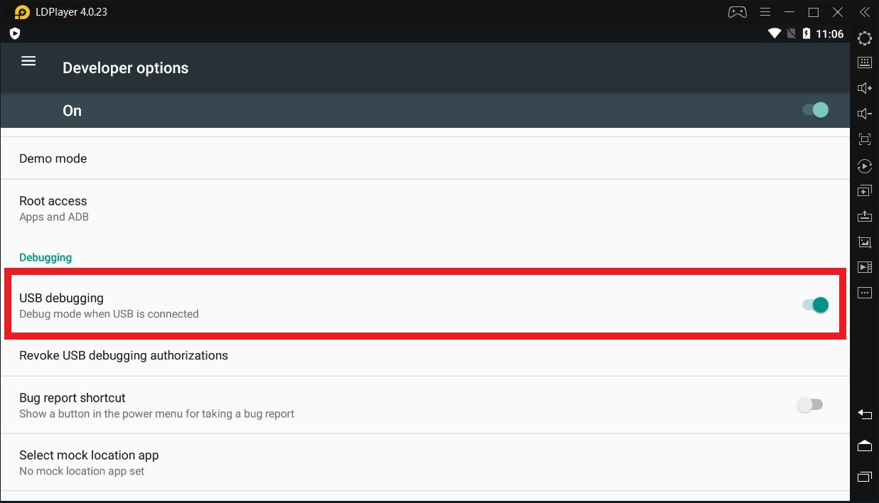 Step 4: Now go to developer options and allow USB debugging option in LD player as shown below: