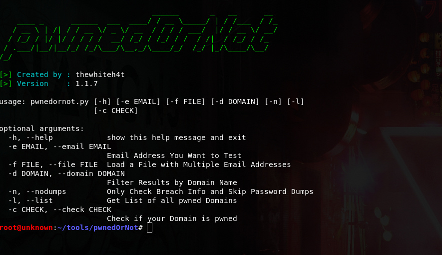 usage: pwnedornot.py [-h] [-e EMAIL] [-f FILE] [-d DOMAIN] [-n] [-l]
