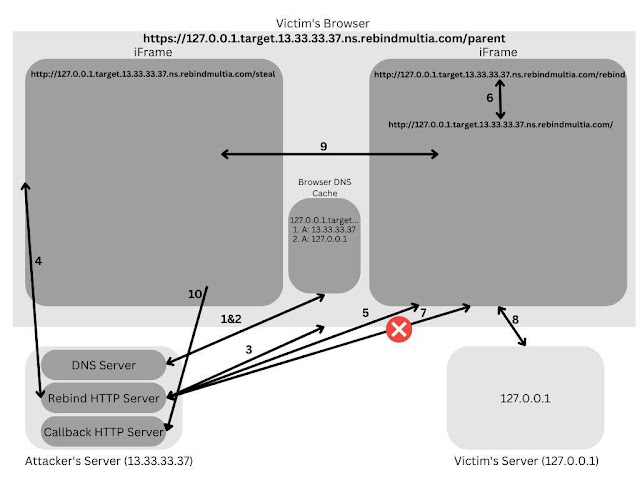 server.py) parses the requested dns name and returns two A records:13.33.33.37and127.0.0.1. - The victim’s browser reaches out the attacker’s malicious HTTP server (included in