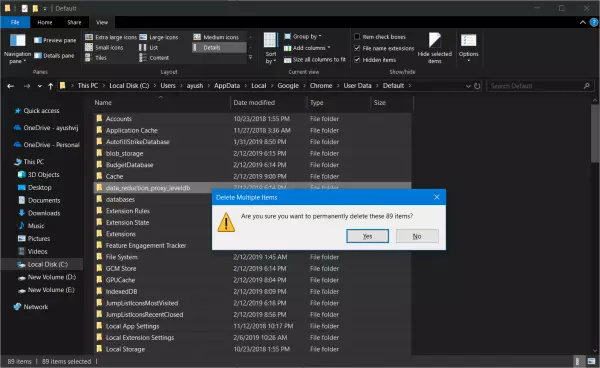 Now, select the folder named as Default and hit the Shift + Delete button combinations and then click on Yes for the confirmation prompt you get.