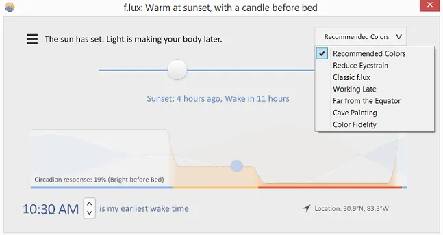 What’s great about f.lux is that you don’t have to do much to the settings. Just set it to Recommended Colors , type in your zip code, and it’ll take care of the rest. It uses your location to determine the time of day and brightness so it can adjust the settings for you.