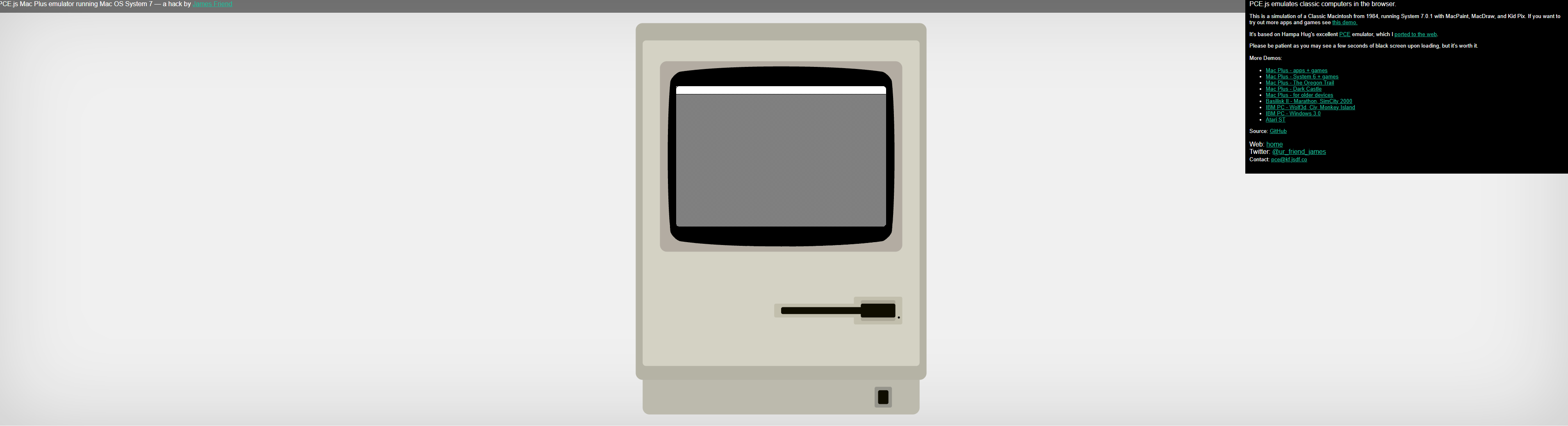What it is: Browser ports of the PCE emulator. Includes Mac OS 7/8, IBM PC (with Wolfenstein preloaded), Atari ST.