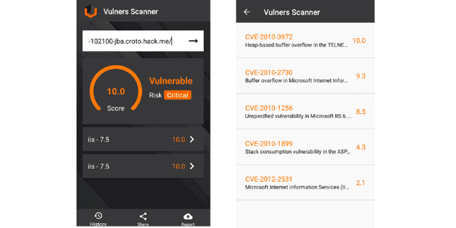 Vulners Scanner tool has those qualities also. This application is made for the purpose of vulnerability scanning using Android by Vulner Team. The application looks really great and cool. It gives the vulnerability risk in the form of a score. The tests it performs are completely legal. It doesn’t perform any malicious requests, fuzzing.