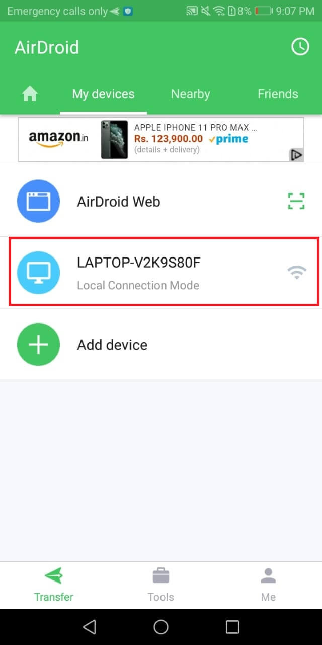 Now, you can also see the option to send files and more to your pc under My Devices tab in your AirDroid android app.