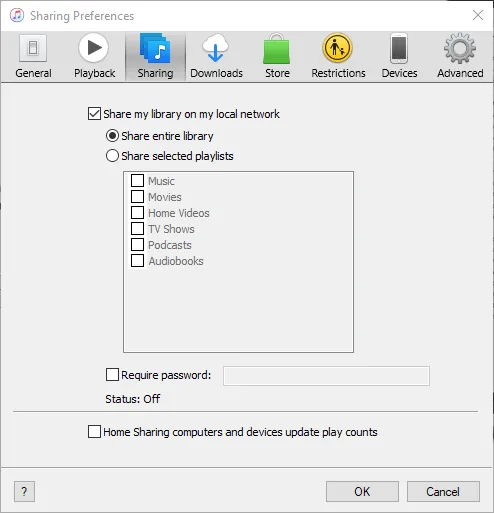 Share entire library – as the name implies, this option lets you share your entire media library on your local network. Only choose this if you’re comfortable with all of your iTunes content being available on another computer.