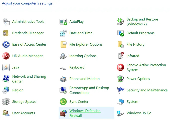 Ensure you’re viewing the panel in either large or small icons mode. Then find and click on the option that says Windows Defender Firewall to open your firewall settings.
