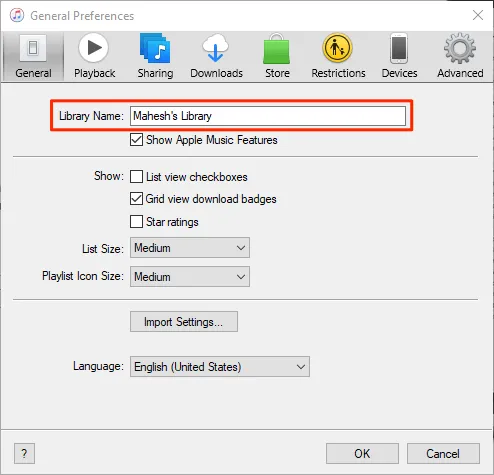 You should be in the General tab by default. On this screen, you’ll find the name of your library next to the Library Name field. You can edit this name if you want as this is what’s going to appear on the receiving computer.