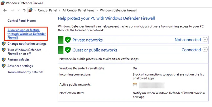 On the following screen, click on Allow an app or feature through Windows Defender Wireless in the left sidebar.