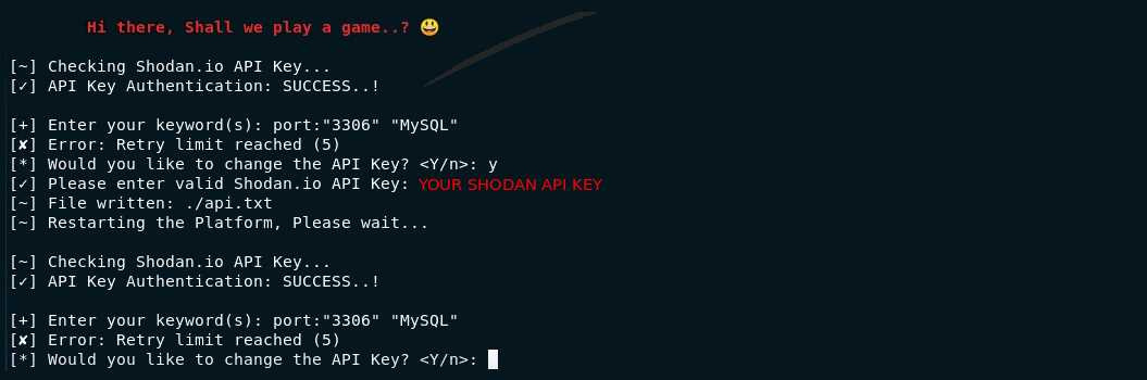 Make sure that your Shodan API key you are entering is valid. I personally recommended to take out a paid subscription, but however, a free account is sufficient to do a lot of things.