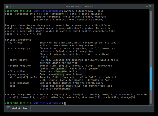 usage: sitedorks [-h] [-cat <category>] [-count <count>] [-engine <engine>] [-file <file>] [-query <query>][-site <on|off|inurl>] [-excl <domains>] [-echo]Use your favorite search engine to search for a search term with different websites. Use single quotes arounda query with double quotes. Be sure to enclose a query with single quotes it contains shell control characterslike space or ';', '>', '|', etc.optional arguments: -h, --help Show this help message, print categories on file (add -file to check other CSV file) and exit. -cat <category> Choose from 1 or more categories, use ',' (comma) as delimiter. Defaults to all categories. -count <count> How many websites checked per query. Google has a maximum length for queries. -engine <engine> Search with 'google', 'baidu' , 'bing', 'duckduckgo' 'yahoo' or 'yandex', defaults to 'google'. -file <file> Enter a custom website list. -query <query> Enter a mandatory search term. -site <on|off|inurl> Turn the 'site:' operator 'on' or 'off', or replace it with 'inurl:' (only for Google), defaults to 'on'. -excl <domains> Excluded these domains from the search query. -echo Prints the search query URLs, for further use like piping or bookmarking.usage: sitedorks [-h] [-cat <category>] [-count <count>] [-engine <engine>] [-file <file>] [-query <query>] [-site <on|off|inurl>] [-excl <domains>] [-echo]