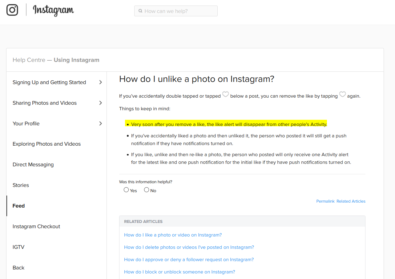 - Very soon after you remove a like, the like alert will disappear from other people’s Activity.