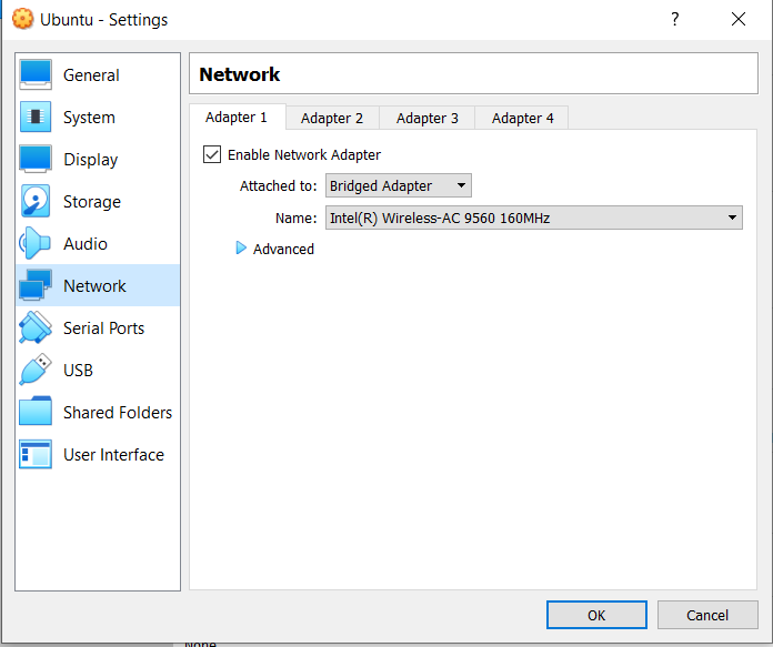 - In Adapter1, change the attribute “Attached to” . Select Bridged Adapter from the drop down menu. (Also, make sure that the adapter is enabled )