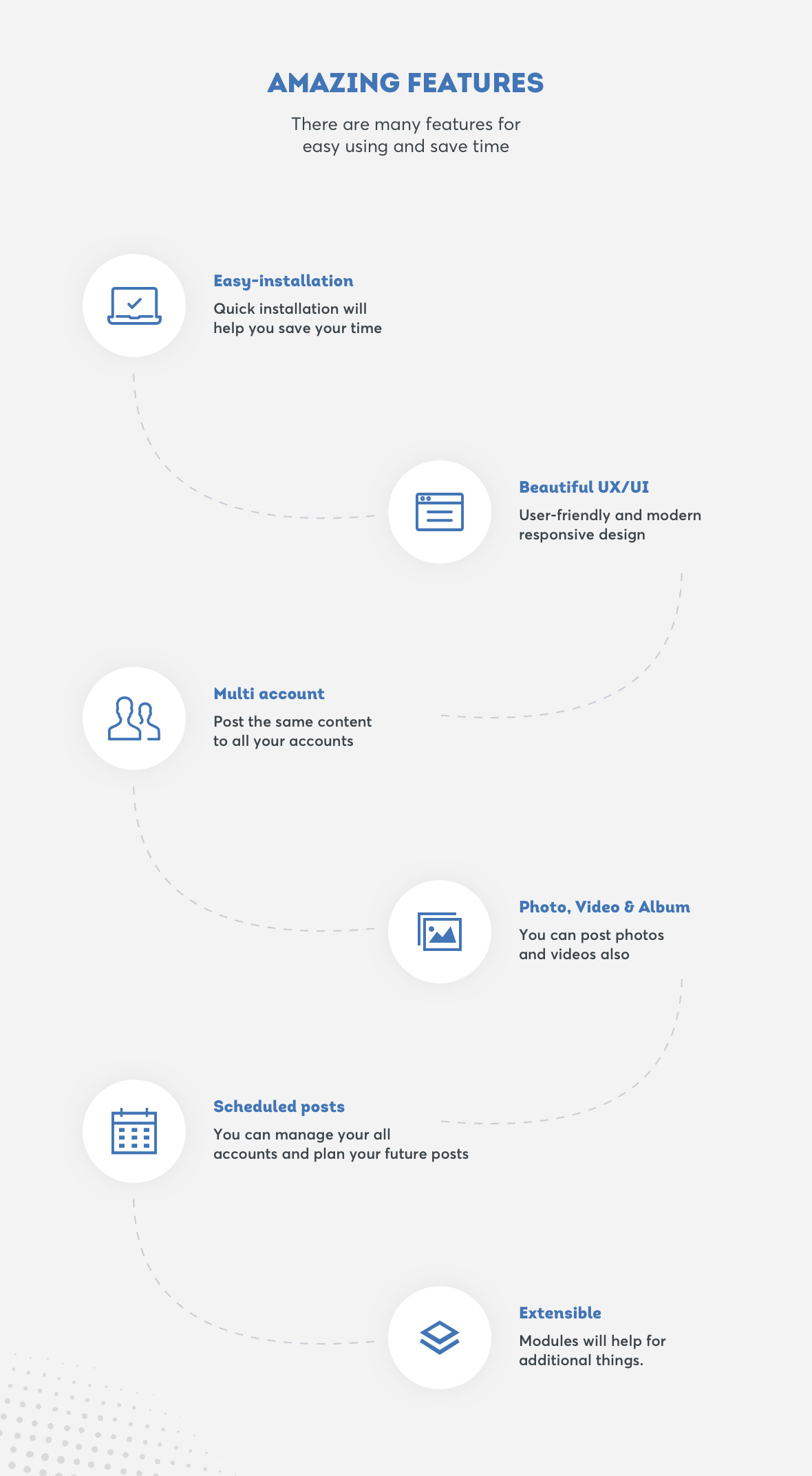 - Media library : Upload and Keeping all of your photos, videos for future use