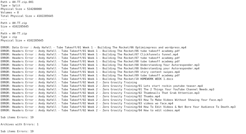 Archive ‘AH-TT.zip.002’ is corrupted. And 19 sub items (18 files + 1 directory) are damaged.