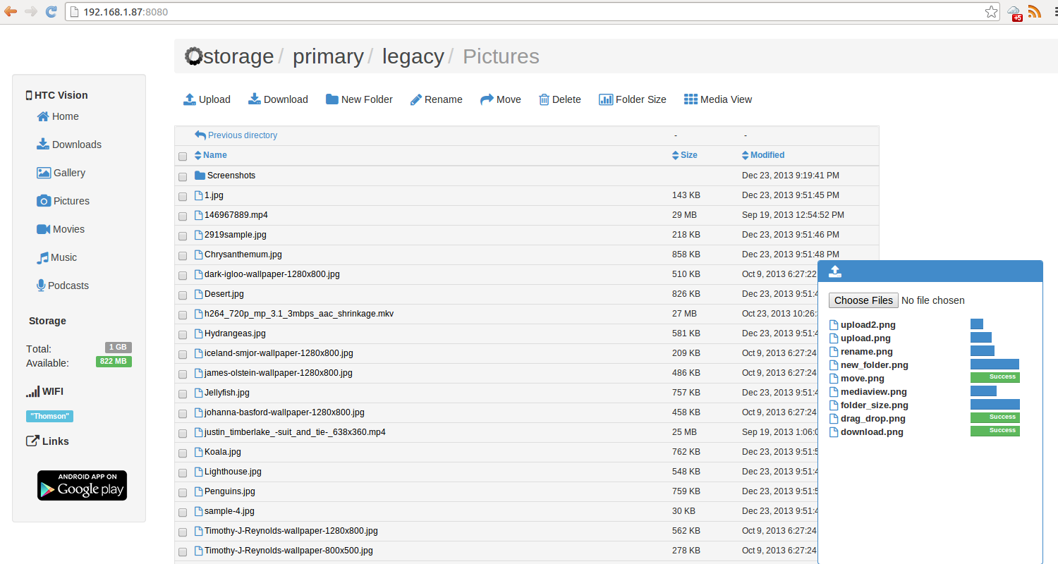 With Droid Over WiFi, you can easily upload, download, and modify files and directories. If you have multimedia files on your phone, they can be easily streamed using the browser.