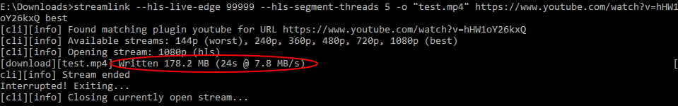 Below is an example output of this command that downloaded 24 sec. / 178 MB of live stream: