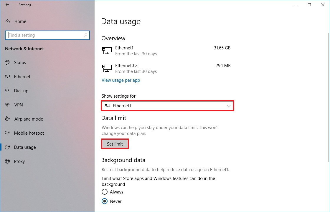 If you’re using an internet connection with a limited data plan, you can set limits for a Wi-Fi or Ethernet network adapter to allow Windows 10 to monitor, restrict unnecessary usage, and provide notifications to help you avoid going over your plan. Here’s how using the Data Usage settings: