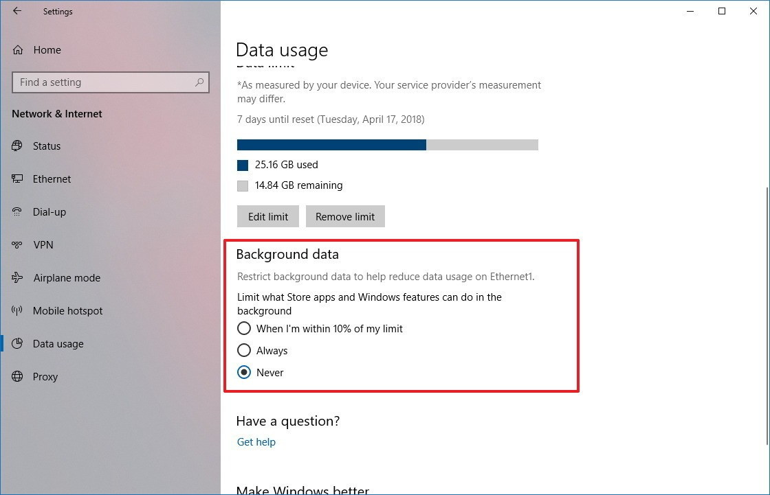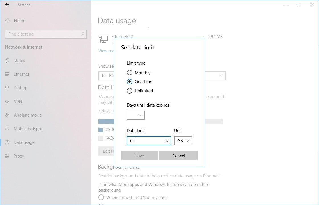 How to configure data usage limit on Windows 10