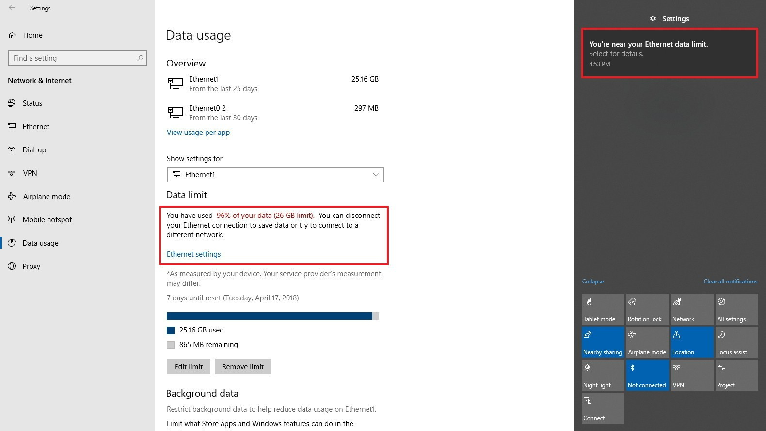 After setting up a data limit for a network adapter, you can always edit your settings or remove the current limit.