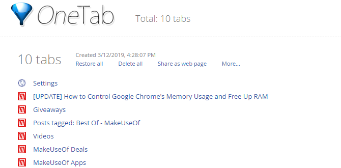 If you want to suspend every single tab, OneTab is a better option. The extension collapses every single tab you have open without exceptions. It moves all the tabs into one list. You can then restore all tabs with one click, restore selective tabs, or close them all permanently.