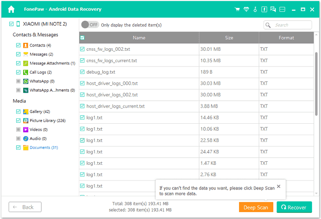 When Deep Scan is finished, all your Android files will be displayed. To look at only the deleted files, tap the “ON” icon on the top to set to display the deleted items only. Select the deleted files that you are looking for and click “Recover” . The deleted files will be retrieved and saved on your computer.