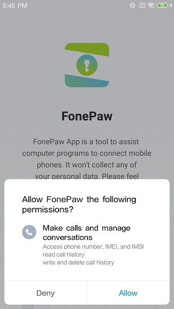 The program will prompt you to install the FonePaw app, an app that is used to grant privileges for the program to access files on your Android. Only by using the app can the desktop program read and recover deleted files from your phone.