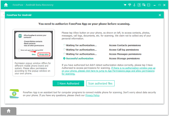 After the FonePaw app is installed, it will give the pop-up notification for you to allow access to contacts, messages, storage, call logs to scan out deleted files. Tap Allow to all messages and click Scan Authorized Files to begin searching for deleted files on your Android phone.