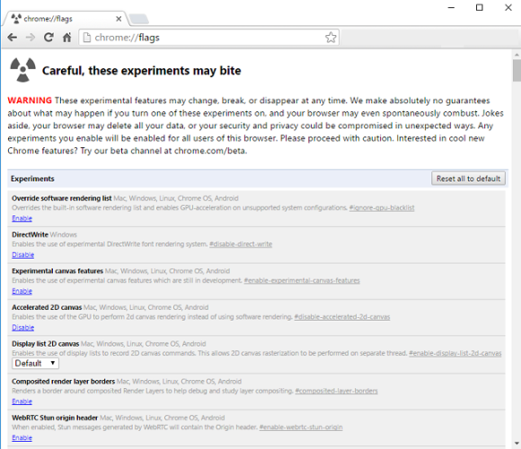 If you find that you’ve broken something but you’re not sure which setting caused the problem, you can easily restore all the flags to their default settings. Look for the Reset All To Default option in the top right-hand corner of the menu. Click it, and restart your browser.