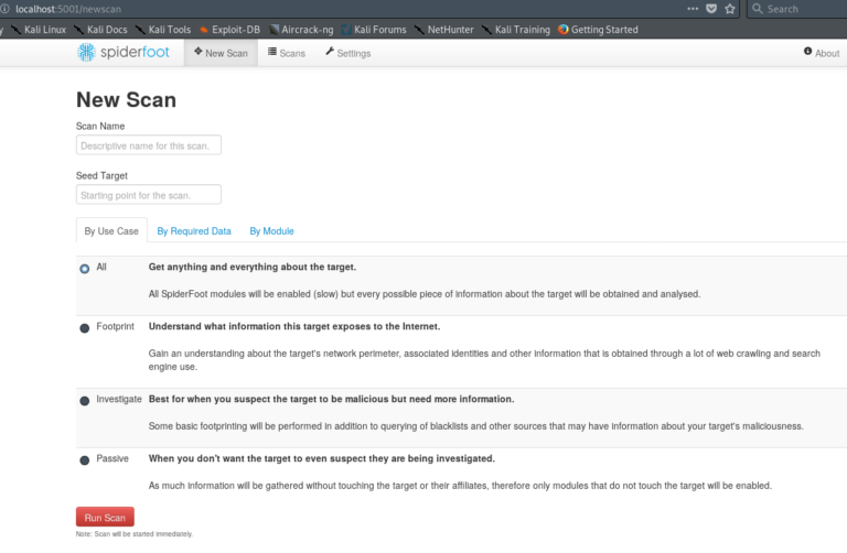 Detailed step by instructions for installing, configuring and running a scan using SpiderFoot can be found on the documentation page http://www.spiderfoot.net/documentation/