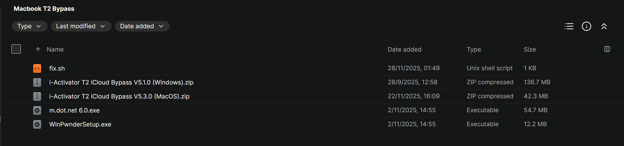 i-Activator T2 iCloud Bypass V5.1.0 (Windows).zipโ 136.7 MBi-Activator T2 iCloud Bypass V5.3.0 (MacOS).zipโ 42.3 MBm.dot.net 6.0.exeโ .NET runtime dependencyWinPwnderSetup.exeโ required toolfix.shโ shell script for edge cases