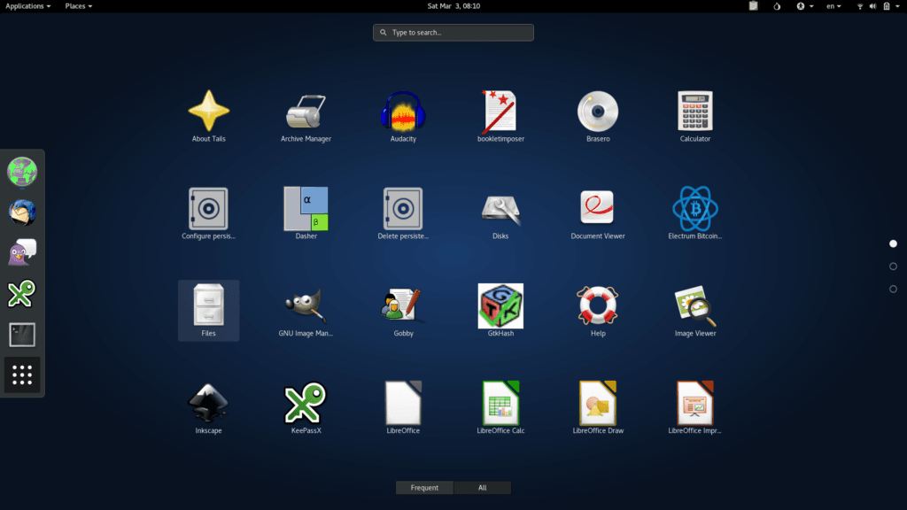 Tails comes with several built-in applications pre-configured with security in mind: web browser, instant messaging client, email client, office suite, image and sound editor, etc.