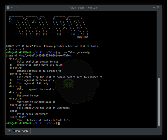 Talon is a tool designed to perform automated password guessing attacks while remaining undetected. Talon can enumerate a list of users to identify which users are valid, using Kerberos. Talon can also perform a password guessing attack against the Kerberos and LDAPS (LDAP Secure) services. Talon can either use a single domain controller or multiple ones to perform these attacks, randomizing each attempt, between the domain controllers and services (LDAP or Kerberos).